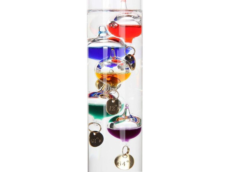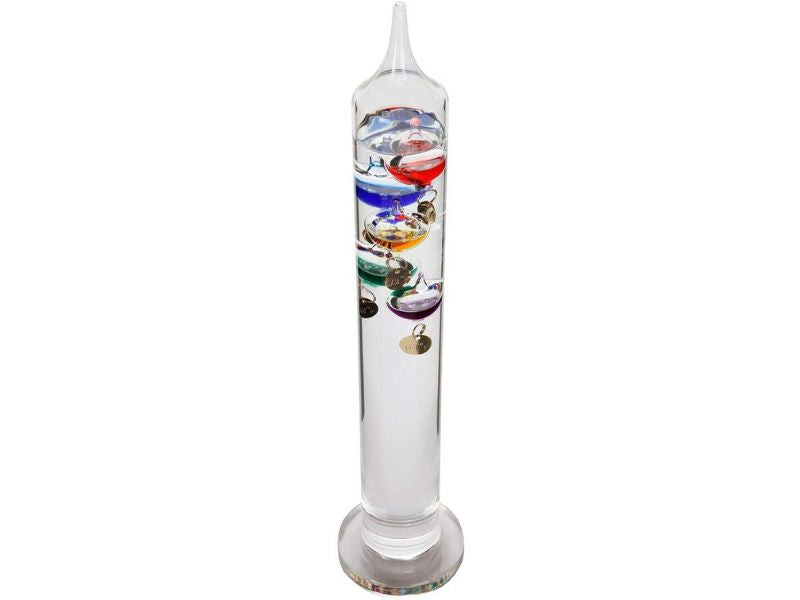 Based on Galileo Galileis discovery that a liquids buoyancy decreases as its temperature increases. This unique device consists of a sealed glass cylinder containing multi colored floating spheres. The spheres have different weights which rise and fall at different temperatures. Current temperature is indicated by the silver tag attached to the lowest of the floating spheres. Use in science classes to demonstrate Galileo's principle or as an interesting and attractive way to accurately measure indoor ambient temperature anywhere.Note:To preserve the function and appearance of this product the Galileo thermometer should not be left out in direct sunlight.