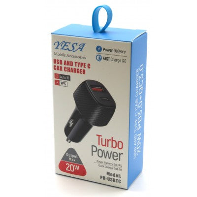 PH-USBTC - USB CAR CHARGER DUAL USB C AND USB PORT 5v@3A PD3.0+QC3.0 20W