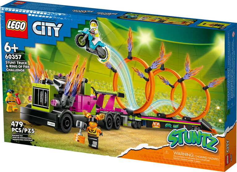 Bring the show to town with the LEGO City Stunt Truck and Ring of Fire Challenge (60357). This actiontoy playset for ages 6+ includes a cool truck with fiery exhaust stacks and a flatbed trailer with a folddown launch ramp and 3 adjustable rings of fire. Just add the flywheelpowered stunt motorcycle truck driver and 2 Stuntz rider minifigures for hours of actionpacked play. Printed and digital building guides Includes a pictorial building guide and the LEGO Builder app a digital companion with intuitive zoom and rotate tools that enable kids to visualize models from all angles as they build. Cool toys for kids LEGO City toys put children at the heart of the action with realistic vehicles featurerich structures and inspiring characters for fun role play. Combine this playset with others from the LEGO City Stuntz range for more stunt action.