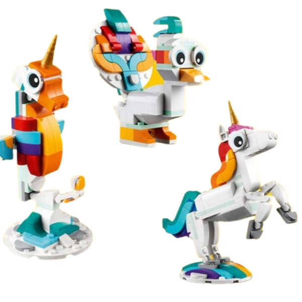 It features a unicorn toy with a golden horn colorful tail and posable legs and hooves. It can be presented in 2 different positions: standing on 4 legs or reared up on its 2 hind legs for an iconic pose and displayed on the set's rainbow stand. Build colorful animals from LEGO bricks The mythical action never stops with 3 different magical creatures for little builders to assemble in this LEGO Creator 3in1 set. They can build a posable Magical Unicorn rebuild it into a posable seahorse toy with a seabed stand turn it into a posable magical peacock with a colorful tail or even use the bricks to create another enchanting creature. LEGO Builder app Download the LEGO Builder app and step into a new world of building fun where kids can zoom in and rotate models in 3D save sets and track their progress.