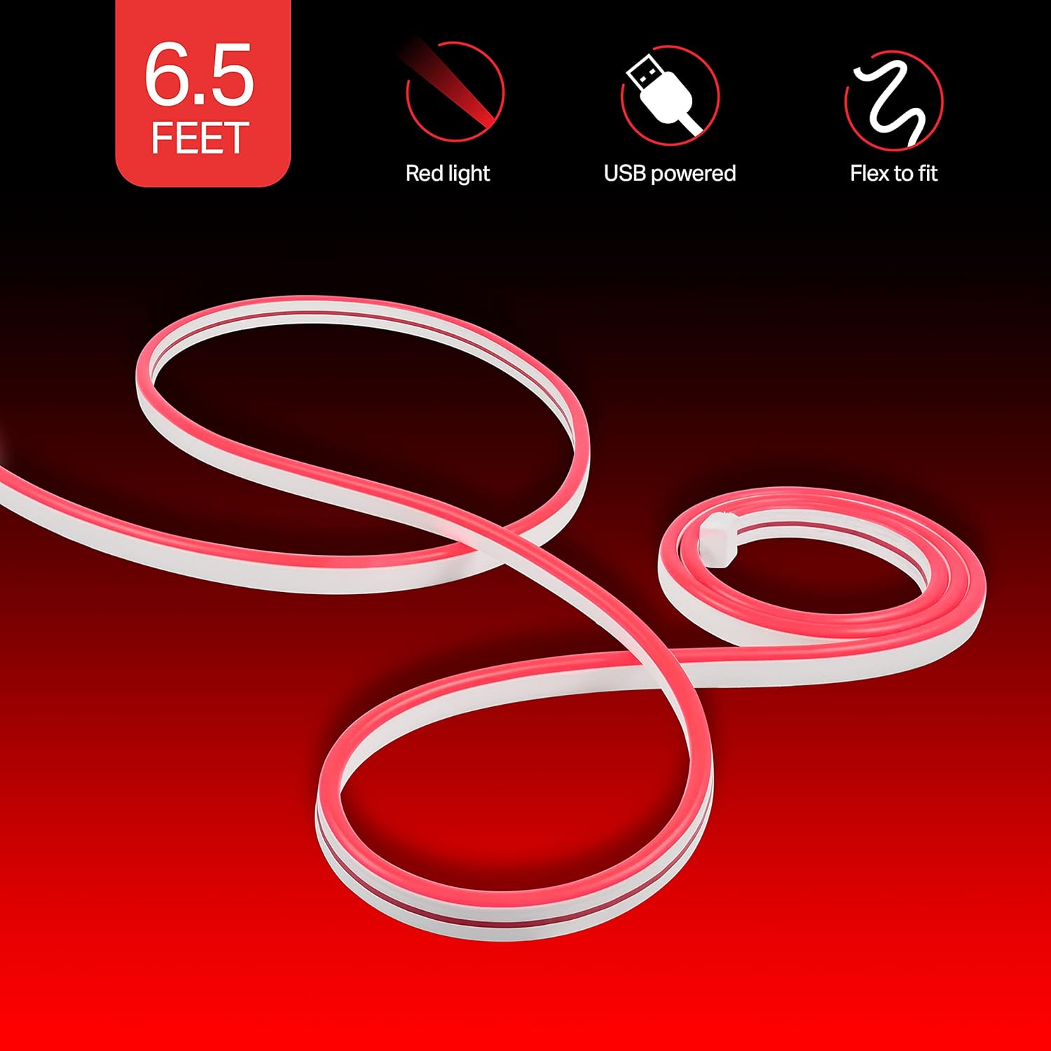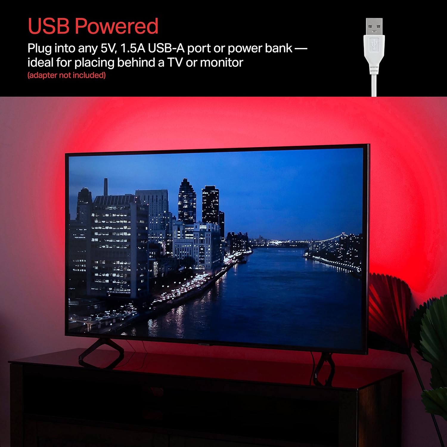 Add a stylish pop of color to your space with the Lights by Night SingleColor USB Flex Light. Shining a vibrant red this sleek LED strand is the perfect addition to enhance gaming setups home theaters home offices and more. The thin flexible design is easily shaped around the corners of furniture or laid flat in a straight lowprofile line. The end of the strand features a convenient USBA plug that can be connected to any 5V 1.5A USBA port or power bank (adapter not included) — ideal for placing behind a TV or monitor. Everything you need for an easy installation comes with the flex light including doublesided tape screws and mounting clips. Operation is incredibly simple as well. Once in place whether mounted or set securely on a flat surface all you have to do is plug the USBA end of the light into the power source — the strand will automatically light up! You can even get the perfect fit by trimming the length of the strand by cutting along the lines on the light. For streamlined and stylish accent lighting use the Lights by Night SingleColor USB Flex Light.