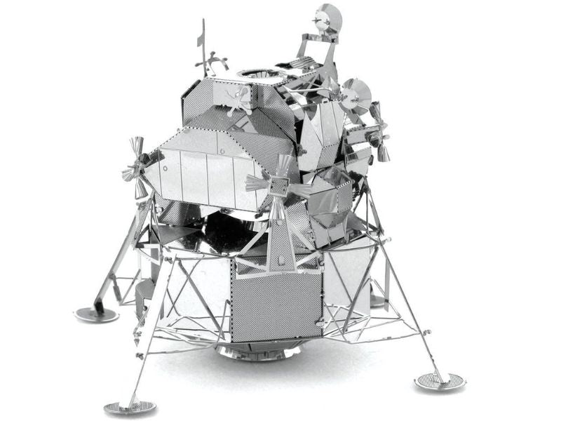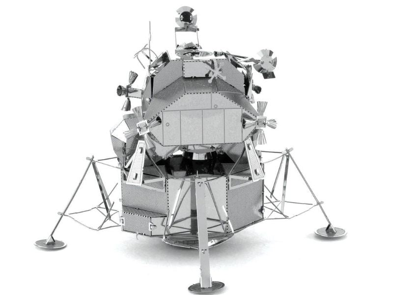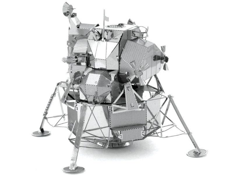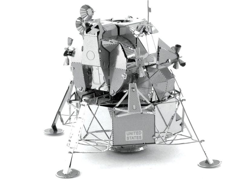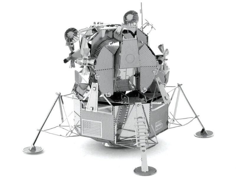 Apollo Lunar Module The Lunar Lander (LEM) was a two stage spacecraft that was used to carry a crew of two astronauts from the orbiter to the surface of the moon and back. The descent stage housed the landing gear engine and all the fuel needed to land safely on the moon. It also served as the launch pad for the ascent stage to return back to the orbiter and subsequent trip back to the Earth. Six lunar modules were successfully landed on the Moon between 1969 and 1972 during the Apollo Space Program. It was the lunar module of Apollo 13 that saved the lives of the three astronauts on board with its engine replacing the crippled CSM Service Propultion System engine and the batteries supplying power not only for the return trip to Earth but also to recharge the Command Module's batteries which were critical for the reentry. It managing to support 3 astronauts for 90 hours despite being rated to support only 2 astronauts for 45hrs. The Lunar Module has been immortalized in this Metal Earth 3D laser cut steel model. Fully assembled the model is approximately 2 in length and 2 wide and 4 high.