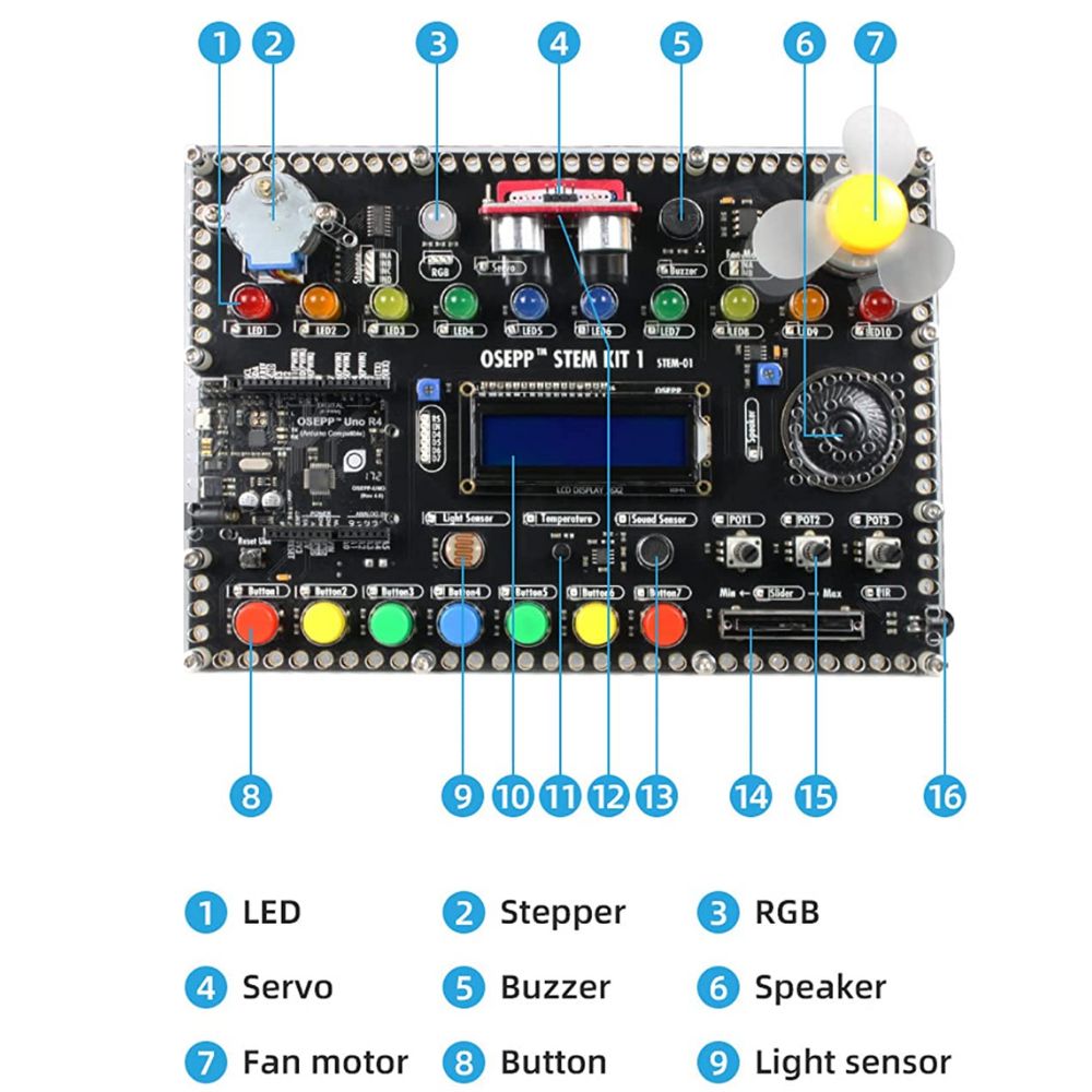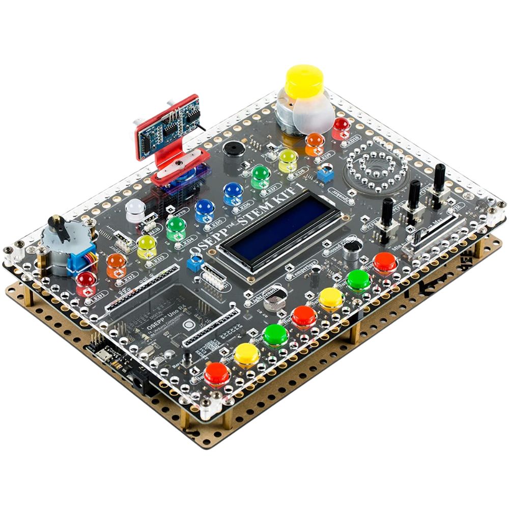 The OSEPP STEM Kit 1 will teach you the eight most commonly used inputs and outputs in the Arduino environment. Once you have mastered these functions using our OseppBlock IDE start programming by using the Arduino IDE without the graphical block support. All the devices listed above are on one circuit board. This way minimal time is spent ?jumping? cables from one module to the next and more time is spent on actual learning.