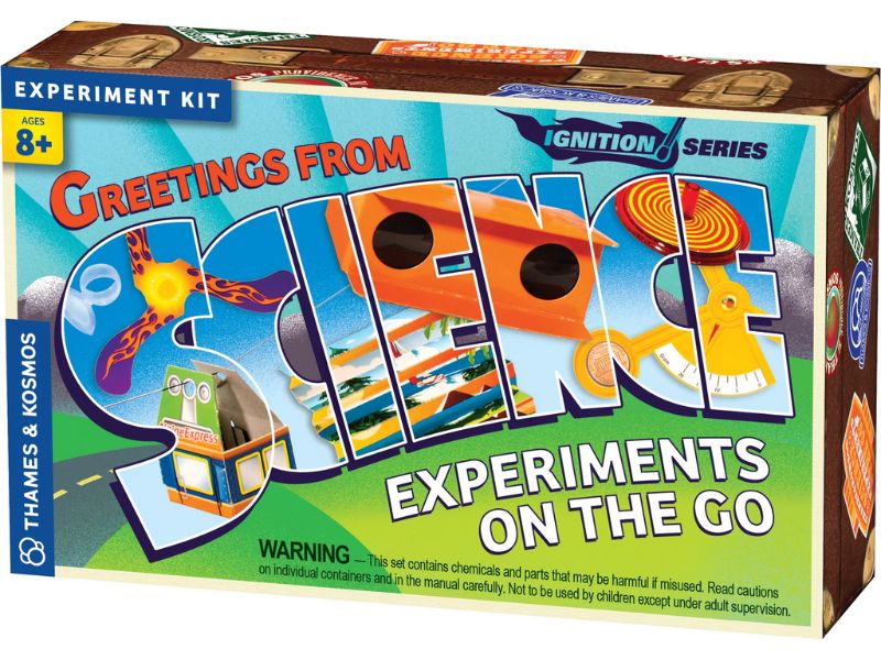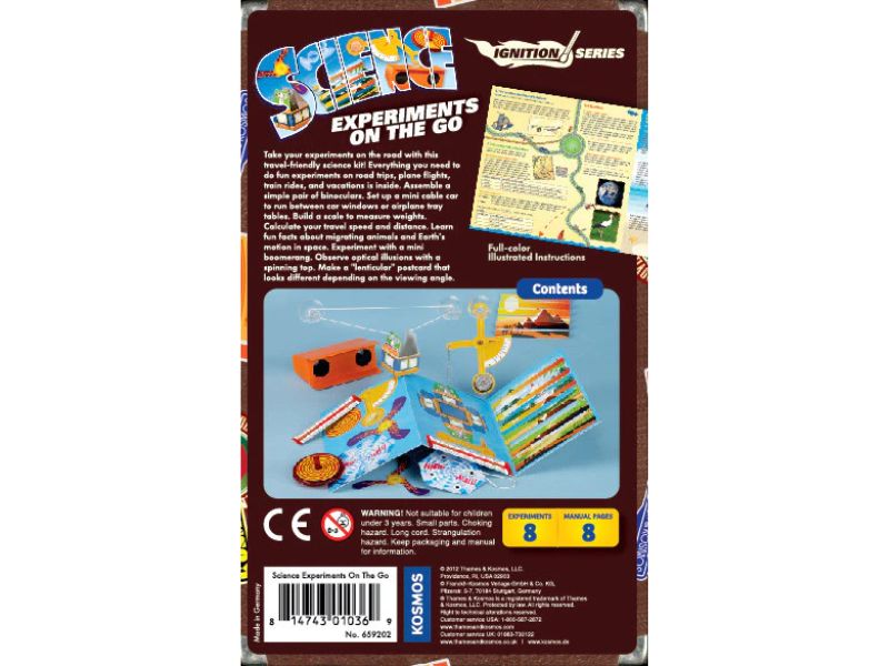 Take your experiments on the road with this travelfriendly science kit! The kit includes everything you need to do fun experiments on road trips plane flights train rides and vacations. Assemble a simple pair of binoculars and learn how they work. Set up a mini cable car to run between car windows or airplane tray tables. Explore rotational speed with a spinning disk experiment. Build a balance scale to measure weights. Calculate how far a distance is on a map and how fast you are traveling. Learn fun facts about migrating animals and how fast Earth is traveling through space. Experiment with a mini boomerang. Observe optical illusions with a spinning top. Make a lenticular postcard that looks different depending on the viewing angle.