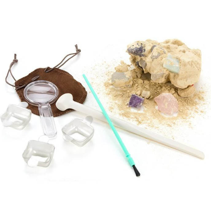 Become an amateur geologist! Use the special included excavation tools to dig out 8 polished genuine gemstones. The young mineral hunters can use the included magnifying glass to examine their new gems up close. Display your finished crystal collection with the included display card.