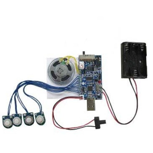 This module plugs directly into the USB port of your PC. Then use the free software to record up to 300 seconds of .wav files to this module. Comes with a speaker and a line out for an additional amplifier or external speakers.