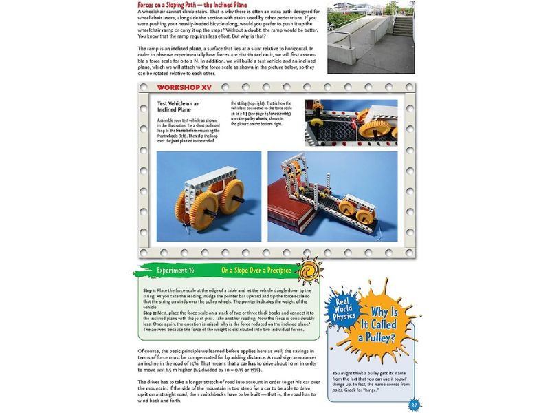 This kit includes more than 300 building pieces. The 64page fullcolor manual presents assembly instructions experiments and explanations in a richlyillustrated easytofollow manner. Ages 8 and up.build a windmill twospeed crane force scale sail car mars robot hammer machine centrifuge pinball game centrifugal switch ships lantern and dozens of other models experiment with simple machines: gears levers screws inclined planes pulleys wheels and axles learn and understand the most fundamental physics equations read about amazing realworld applications for physics.