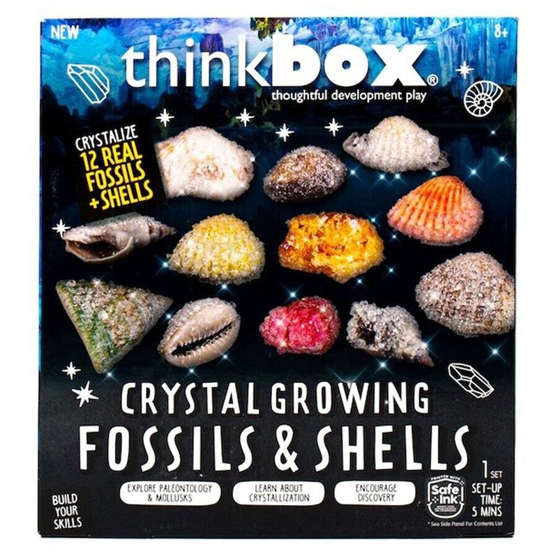 Discover how the fascinating worlds of crystallization fossils conchology and paleontology combine with the Thinkbox® Crystal Growing Fossils & Shells science kit! Complete with a lab tray readytogo crystalgrowing powder glue a paintbrush colorful dyes and fullyillustrated instructions. This STEM learning kit has everything you need to crystallize 12 real fossils and shells while learning the science behind them all! Explore paleontology and discover how the fossils included in this set form. Walk in the footsteps of a conchologist as you take a deep dive into the ocean to discover what makes up the mollusks and shells that reside there. Then transform your treasures into all kinds of colorful crystals in just a few easy steps! This handson science kit guides kids through 5 funfilled activities from crystalgrowing to matchmaking and more. Recommended for ages 8 years and up.
