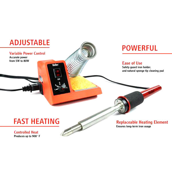 In addition the unit comes with a soldering station that includes a safety guard iron holder sponge tip cleaning pad On/Off switch with poweron indicator light and a variable power control from 5 to 80Watt.