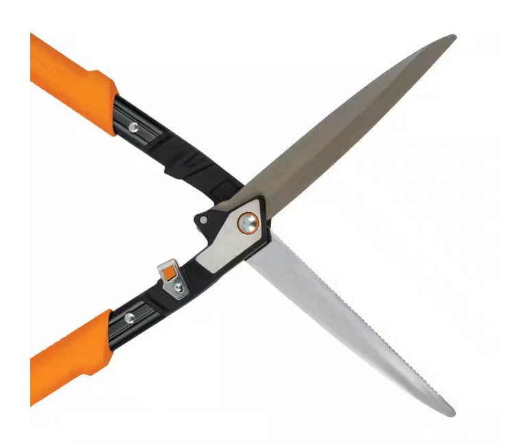 The Fiskars Pro Hedge Shears are a reliable choice for quality performance and longlasting results. Equipped with SpeedDrive lever technology they offer 50% faster cutting than traditional hedge shears. The 9'' blades are constructed of high carbon steel and have been enhanced with UltraSharp nonstick infused plating for maximum durability and longlasting sharpness. The serrated blade grips hedges and stems for clean cuts and they can be easily sharpened and replaced. The handles are extruded aluminum with heavyduty riveted connections for ultimate strength and they feature multiple grip positions to reduce fatigue. Highvisibility SoftGrip handles provide added comfort control and a secure shockreducing bumper to lessen impact. This impactresistant tool contains no plastic components and it has been tested to withstand multiple drops. The Fiskars Pro Hedge Shears offer the reliability and performance you need for quality results.
