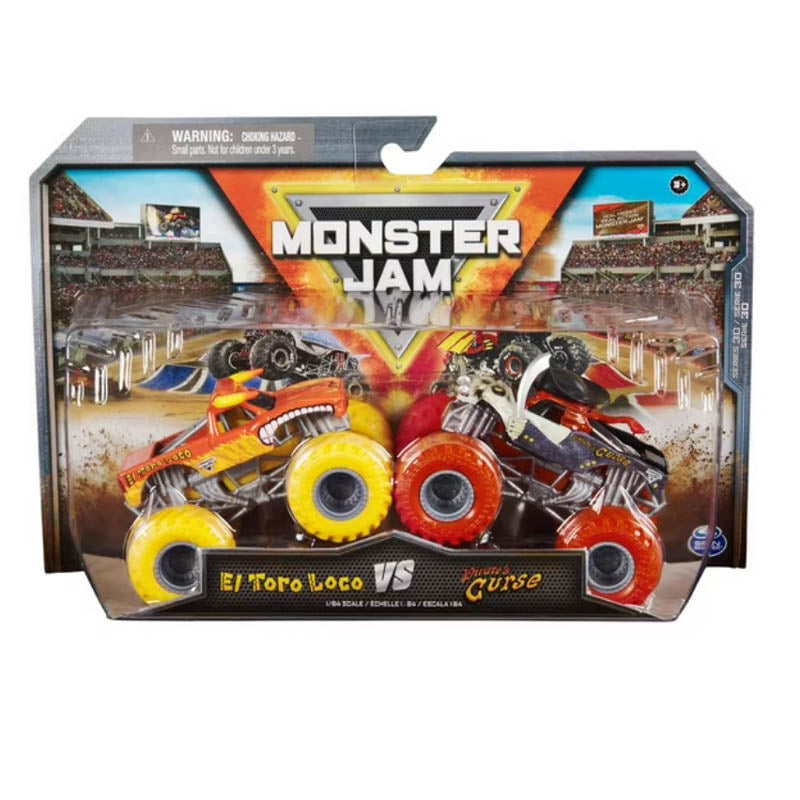 • HEADTOHEAD ACTION: Put on an awesome Monster Jam show with the 2Pack! Each set comes with 2 iconic Monster Jam monster trucks including El Toro Loco Vs. Pirate's Curse Shaker Vs. Soldier Fortune and more!