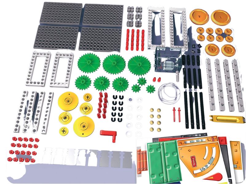 This kit includes more than 300 building pieces. The 64page fullcolor manual presents assembly instructions experiments and explanations in a richlyillustrated easytofollow manner. Ages 8 and up.build a windmill twospeed crane force scale sail car mars robot hammer machine centrifuge pinball game centrifugal switch ships lantern and dozens of other models experiment with simple machines: gears levers screws inclined planes pulleys wheels and axles learn and understand the most fundamental physics equations read about amazing realworld applications for physics.