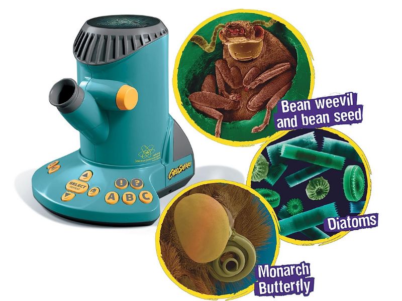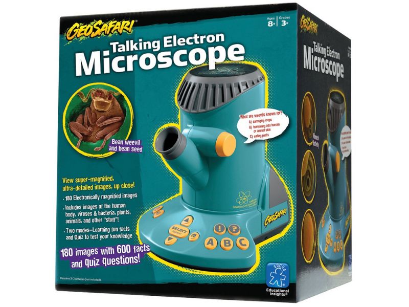 Develop your child's interest about living organisms with the Educational Insights GeoSafari Talking Electron Microscope. It features 180 amazing closeup images of bacteria viruses plants and other biological organisms. The highresolution LCD screen offers a crystalclear view. In the learning mode this educational learning microscope speaks out five interesting facts about each image to add to your child's knowledge. This kids talking microscope can then be switched over to the quiz mode to test your child's grasp and understanding.