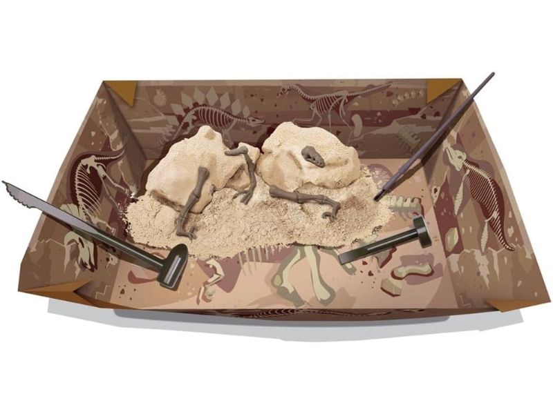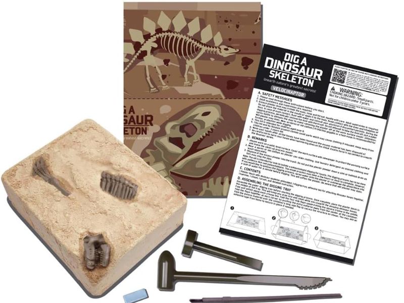 Excavate and assemble the skeleton of a dinosaur. Includes a quiz sheet to challenge friends and family. Set includes: 1 plaster block 1 dinosaur skeleton 1 digging tool 1 brush and 1 instruction and quiz sheet product size between 7” – 11”.