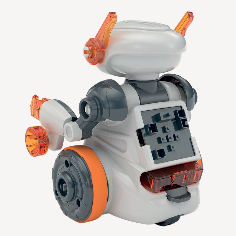 Build your own unique and original robot with plenty of fun play modes! With two infrared sensors the new Mio Robot can avoid obstacles and follow your hand like a real bloodhound. You can use the microphone to command it by simply clapping your hands while the pushbutton panel on the robot's back can be used to programme its route. The free app has two play sections: coding to learn the principles of blockbased programming and real time to control movements sounds and light effects. Lastly with the marker holder and magnet holder respectively you can make the robot draw or programme it to search for small coins and paper clips. Conceived designed and developed in Italy.