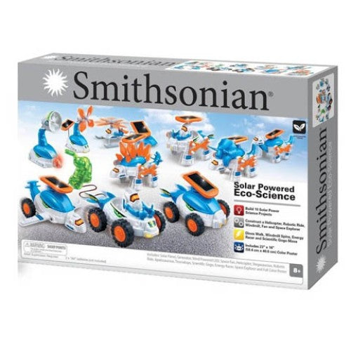 Plastic made in bright blue orange and white. Build 10 solar power science projects. Construct a helicopter robotic ride windmill fan and space explorer. Includes a color poster. Recommended for children ages 8 and up. Teach your child the power and fun of solar energy with the NSI Smithsonian Eco Science. Your child will be able to build 10 solar powered science projects including a helicopter robotic ride windmill fan and space explorer. Made from strong and durable plastic this toy is recommended for children ages eight and up and includes a colorful poster.