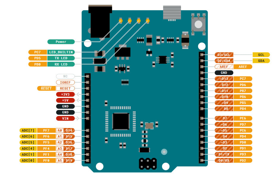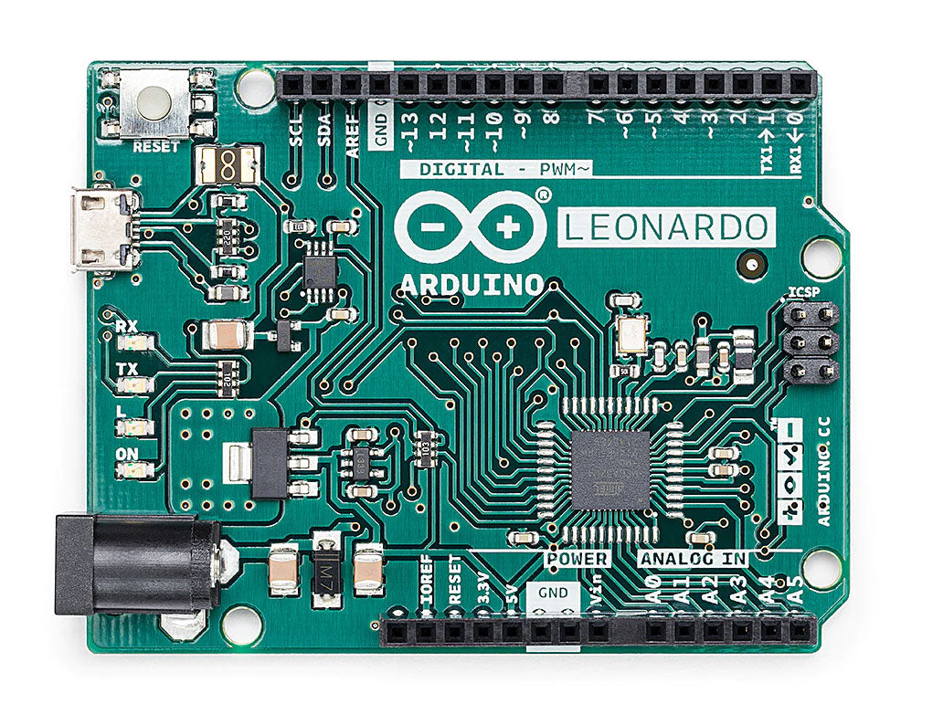 The Arduino Leonardo is a microcontroller board based on the ATmega32u4 (datasheet). It has 20 digital input/output pins (of which 7 can be used as PWM outputs and 12 as analog inputs) a 16 MHz crystal oscillator a micro USB connection a power jack an ICSP header and a reset button. It contains everything needed to support the microcontroller; simply connect it to a computer with a USB cable or power it with a ACtoDC adapter or battery to get started. The Leonardo differs from all preceding boards in that the ATmega32u4 has builtin USB communication eliminating the need for a secondary processor. This allows the Leonardo to appear to a connected computer as a mouse and keyboard in addition to a virtual (CDC) serial / COM port. It also has other implications for the behaviour of the board.