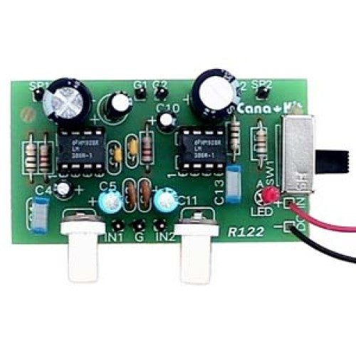 A very compact mini stereo amplifier that can be connected to the headphone jack of any Walkman or portable CD Player. It is based on two LM386 lowvoltage power amplifiers and provides up to 1W of music power for each channel. The circuit includes a stereo cable and a battery holder.