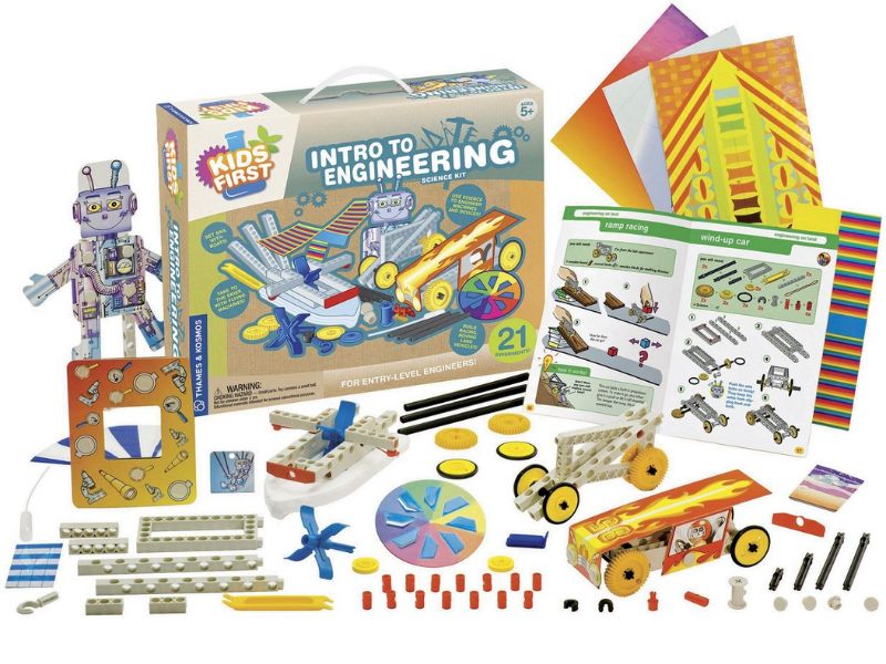 Intro to Engineering from Thames and Kosmos uses handson activities to demonstrate how engineers design machines and devices. Start by learning some engineering basics with experiments on levers forces and pulleys. Build simple devices using these basic components. Move on to explore engineering on land by building vehicles with wheels such as a race car and a windup car. Next investigate engineering with air (and in the air) by building a helicopter a pinwheel a parachute a glider a balloon rocket and an airpowered carousel. Then build a diving bell a sailboat and a paddle boat to experiment with engineering in water.Finally find engineering in your own home with experiments modeling the telephone and television. 25 experiments are presented in a 48 page guidebook.