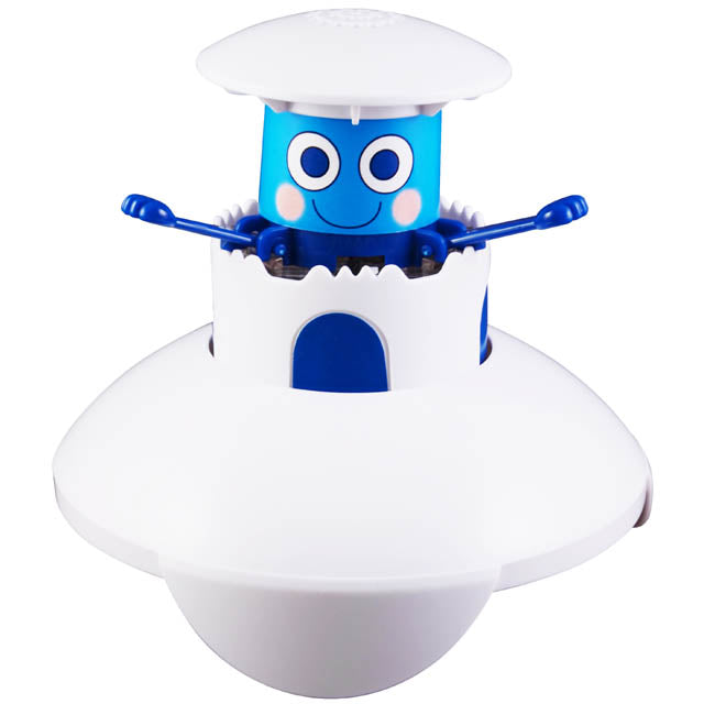 This UFO is controlled by sound! Navigated by a soundsensitive remote control system you can have hours of fun with this little guy. Measures 4.5in tall and 4.5in diameter and weighs 0.5 lbs. The body is colored pearl white and deep blue. Simple assembly is required. No remote control needed!
