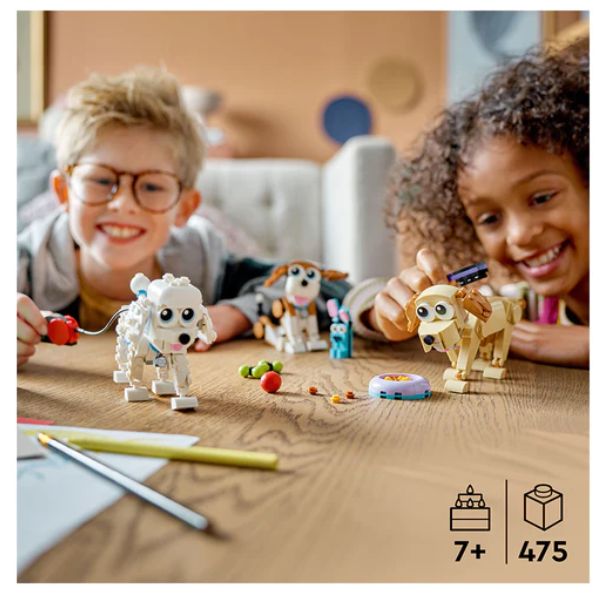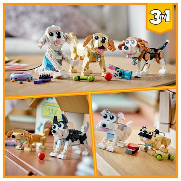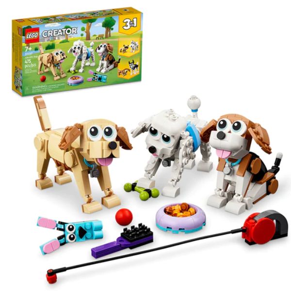 It features a beagle a poodle and a Labrador with posable heads tails and ears plus accessories including a food bowl brush toy rabbit ball and dogwalking leash to add extra fun to kids' makebelieve stories. Gift idea for doglovers The canine action never has to end with 3 collections of dogs to build in this brilliant LEGO Creator 3in1 playset. Kids can build a beagle a poodle and a Labrador rebuild them into a miniature schnauzer and a pug or transform them into a husky and a longhaired dachshund. LEGO Builder app Download the LEGO Builder app and step into a new world of building fun where kids can zoom in and rotate models in 3D save sets and track their progress.