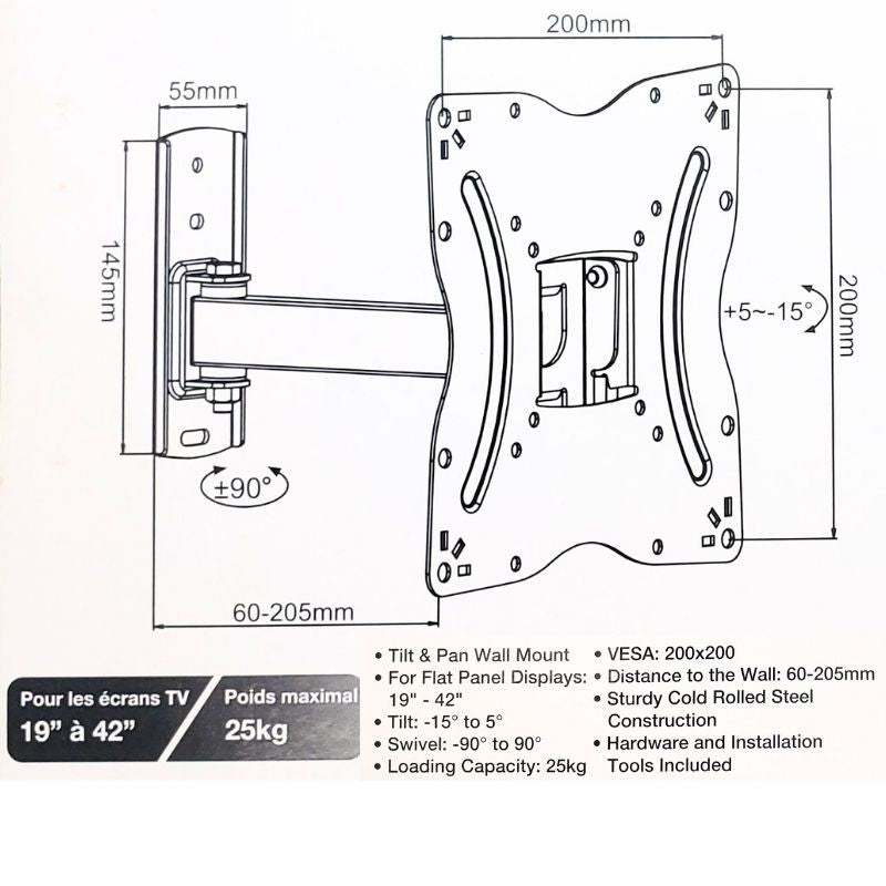 PPA-025 - TV WALLMOUNT 19-42IN TILT/SWIVEL 25KG